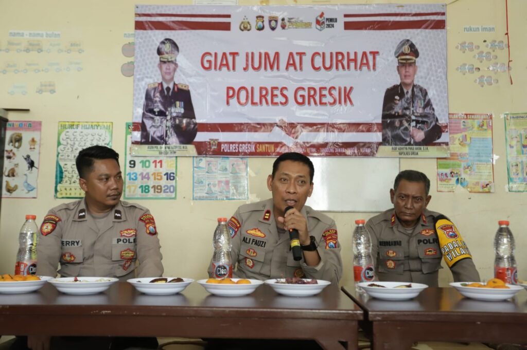 GRESIK – Program Jumat curhat terus dilakukan Polres Gresik secara Door to Door kepada masyarakat. Kali ini Polres Gresik menyambangi warga Desa Ambeng-ambeng, Watangrejo Kecamatan Duduksampeyan, abupaten Gresik. Jumat (12-01-2024).