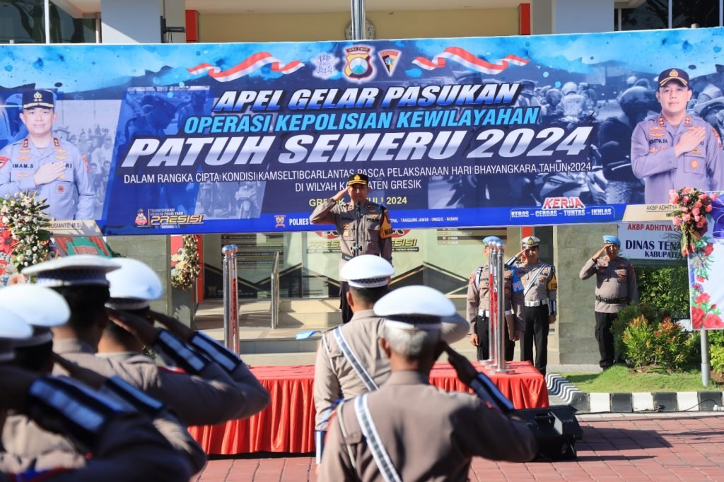GRESIK – Apel Operasi Patuh Semeru 2024 yang dipimpin Wakapolres Gersik Kompol Danu Anindhita Kuncoro Putro dan di ikuti PJU, Kapolsek, Kodim 0817,Dishub Kabupaten Gresik dan personil yang tersprint Ops Patuh Semeru 2024 bertempat di lapangan Mapolres Gresik. (15-07-2024)