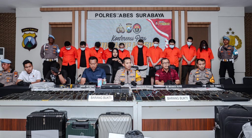 Sementara itu, Kasihumas Polrestabes Surabaya, AKP Haryoko Widhi menambahkan, selain mengamankan 10 tersangka Polisi juga menyita barang bukti di antaranya 18 ponsel berbagai merek, dua laptop, dan ribuan nomor telepon korban.