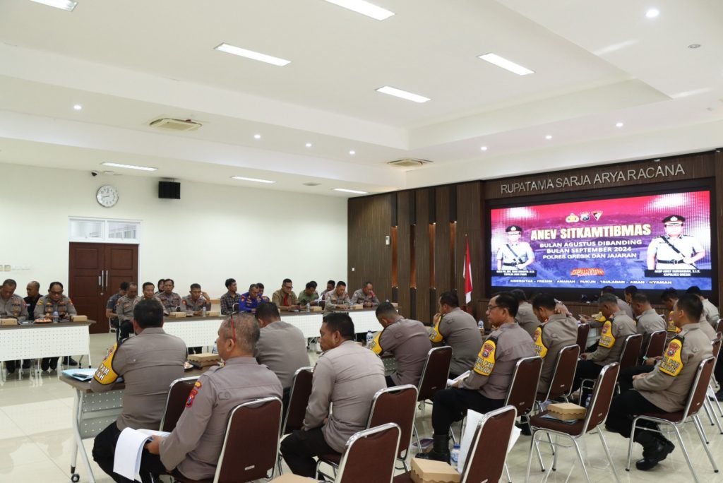 GRESIK – Menjelang pelaksanaan pesta demokrasi Pilkada Kabupaten Gresik 2024, Polres Gresik menggelar Analisa dan Evaluasi Situasi Keamanan dan Ketertiban Masyarakat (Anev Sitkamtibmas) pada Kamis (03/10/2024). Bertempat di Aula Rupatama Sarja Arya Racana.