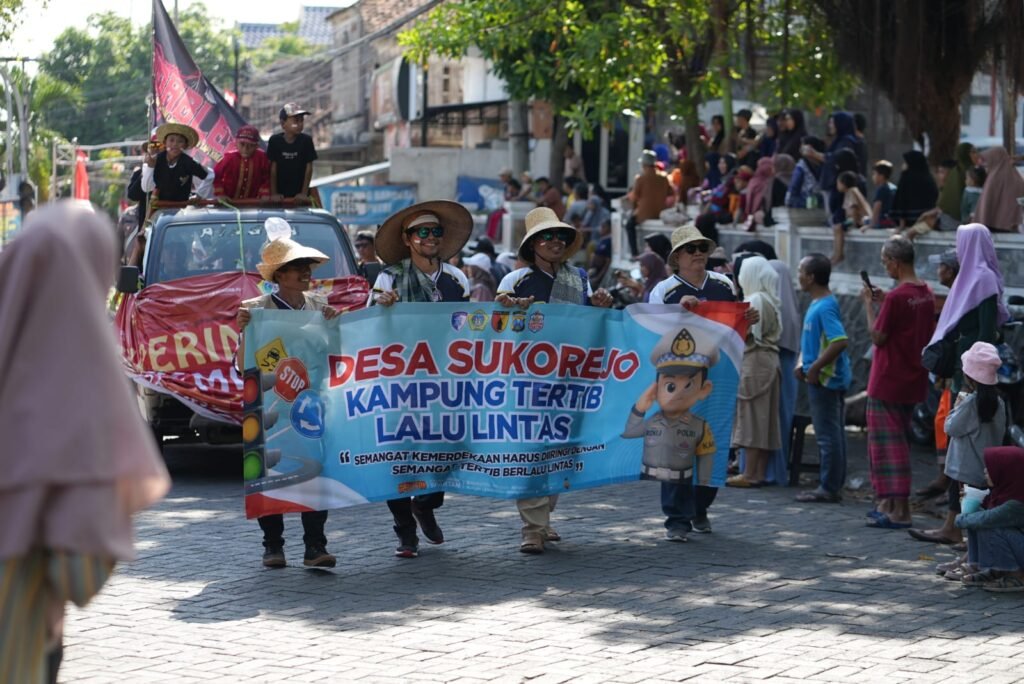 GRESIK – Suasana perayaan HUT Kemerdekaan RI ke-80 di Desa Sukorejo, Kecamatan Kebomas, pada Sabtu (23/8/2025) berlangsung meriah. Ribuan warga tumpah ruah menyaksikan pawai karnaval, Namun, ada yang berbeda dalam karnaval kali ini. Satuan Lalu Lintas (Satlantas) Polres Gresik memanfaatkan momentum tersebut untuk mengedukasi warga tentang tertib berlalu lintas dan keselamatan berkendara.
